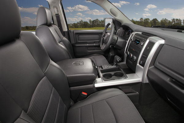 Available Ram design features include: class-exclusive integrated dual exhaust, bold hood bulge, wraparound full chrome bumpers, aggressive forward-leaning grille, six-passenger cab.